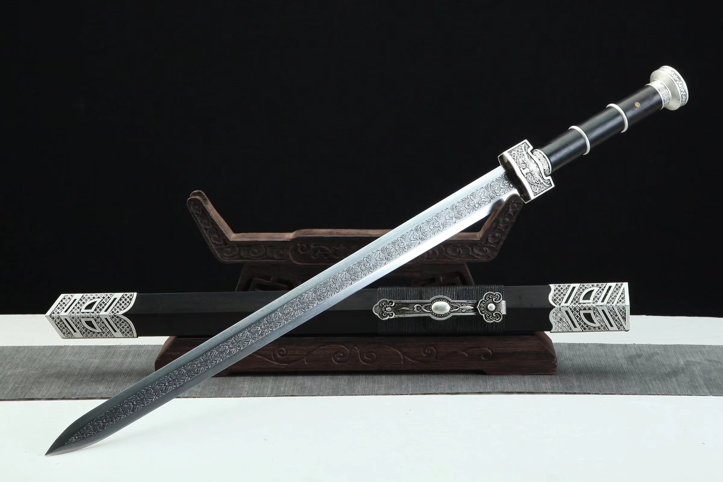装具:合金装、镀沙银;剑鞘:优质乌木;剑身:高碳钢、六面设计、刻前程似锦纹、精细研磨;310。