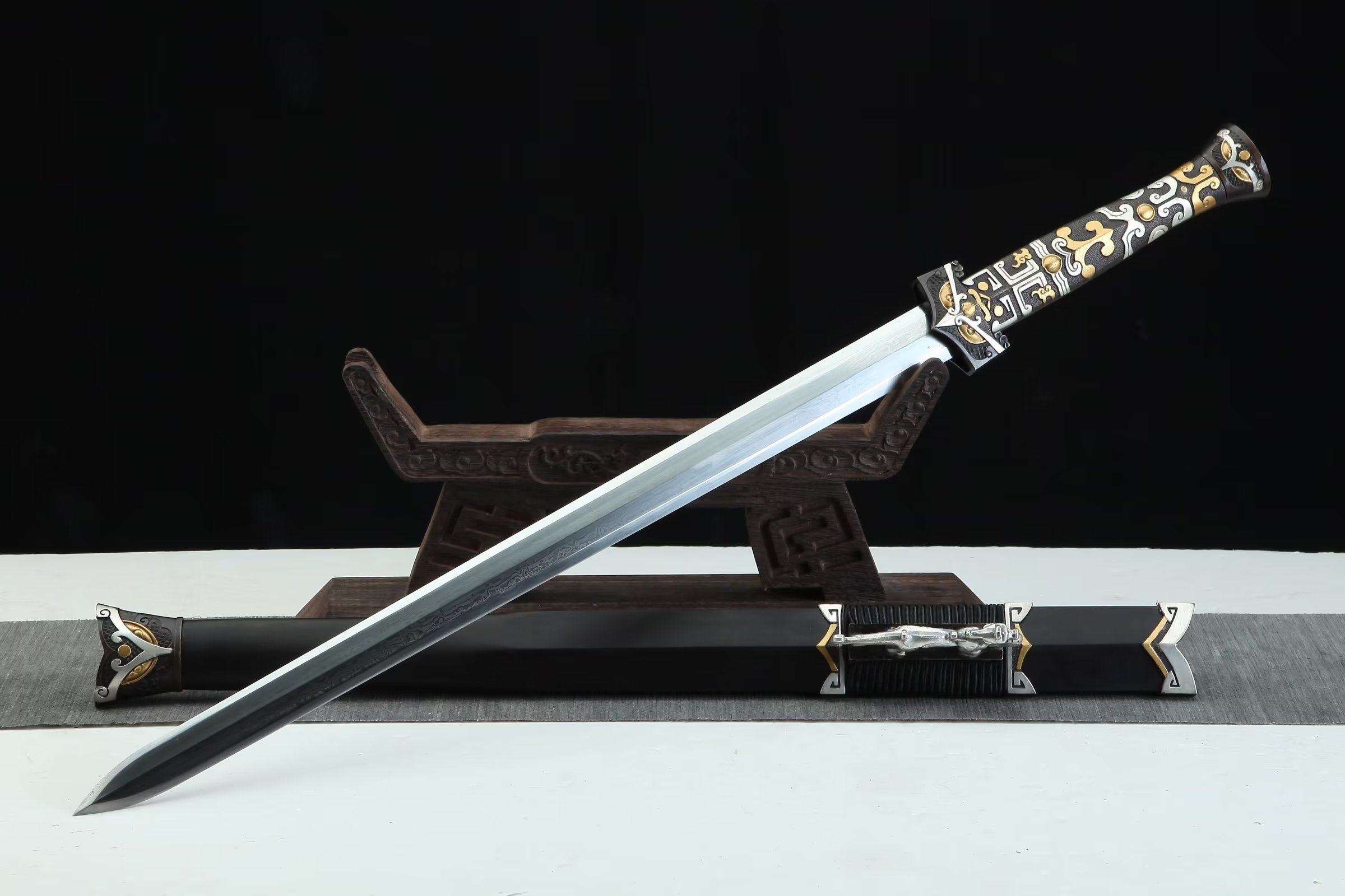 剑鞘:优质黑檀木;剑身:百炼花纹钢、精细手磨1050。花纹钢烧刃另加130。