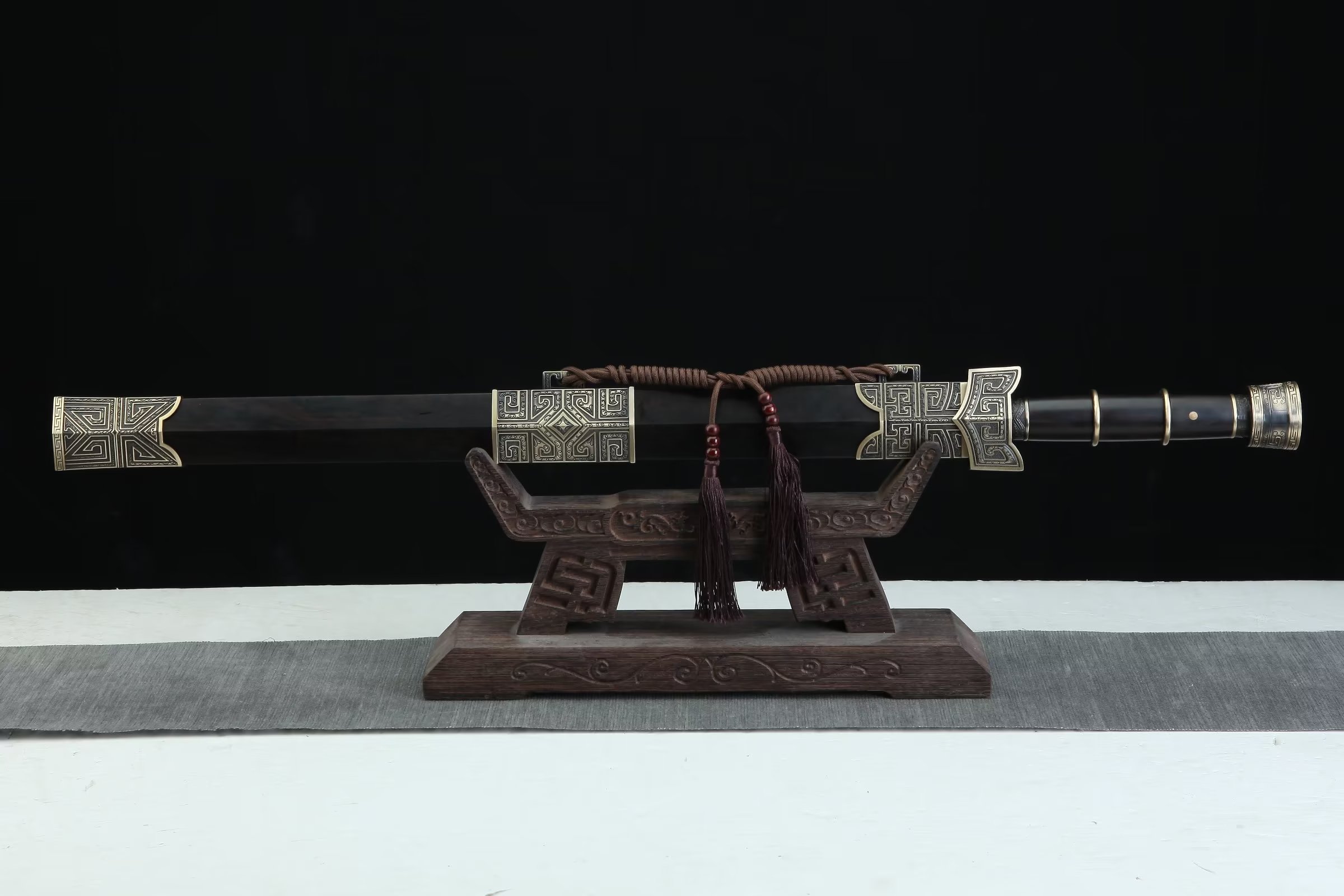 装貝:纯铜精雕、精细打磨、做旧;剑鞘:优质黑檀木;