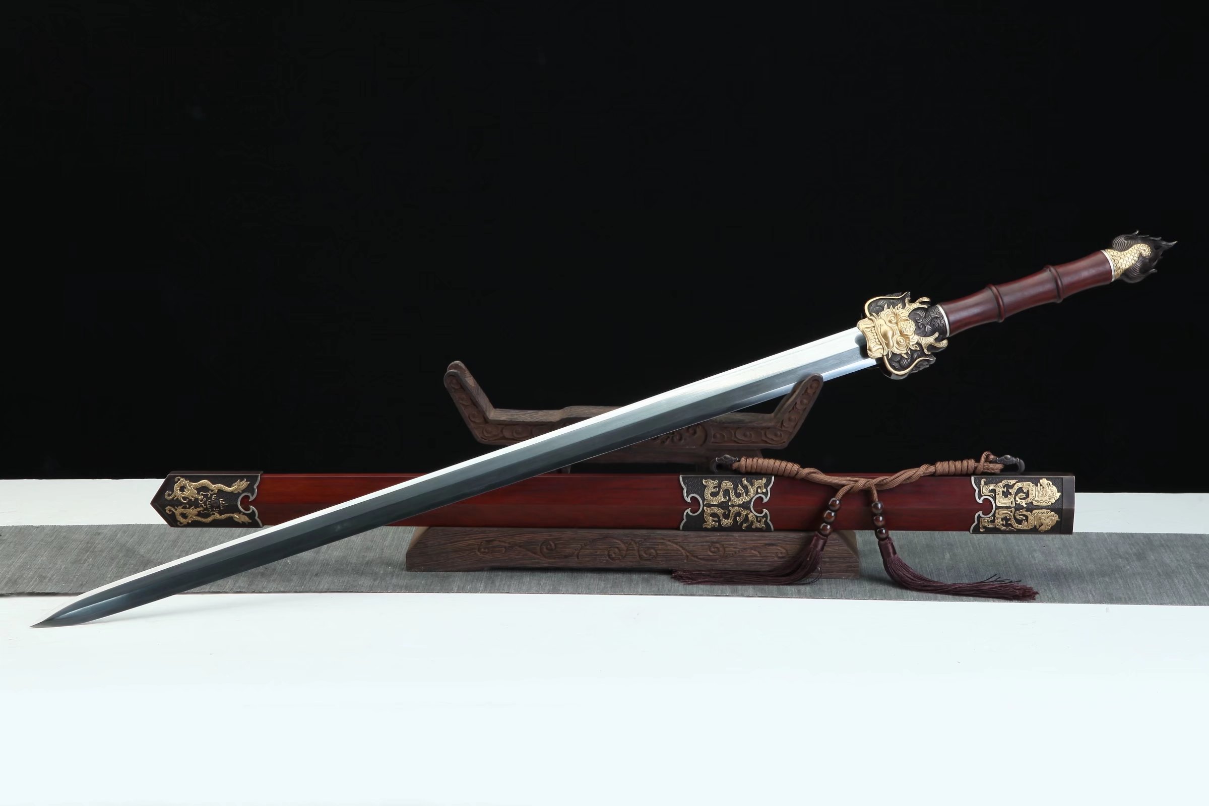 剑鞘:优质酸枝木;剑身:百炼花纹钢,手工锻造、精细手磨1100。花纹钢烧刃另加180。