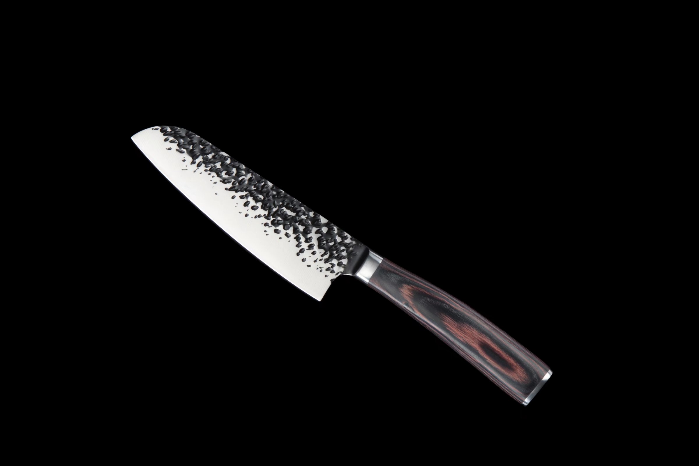 刀身手工锻造、手工锤打纹、精细研磨。黑色彩木刀柄;裸刀50。(注:特价款)