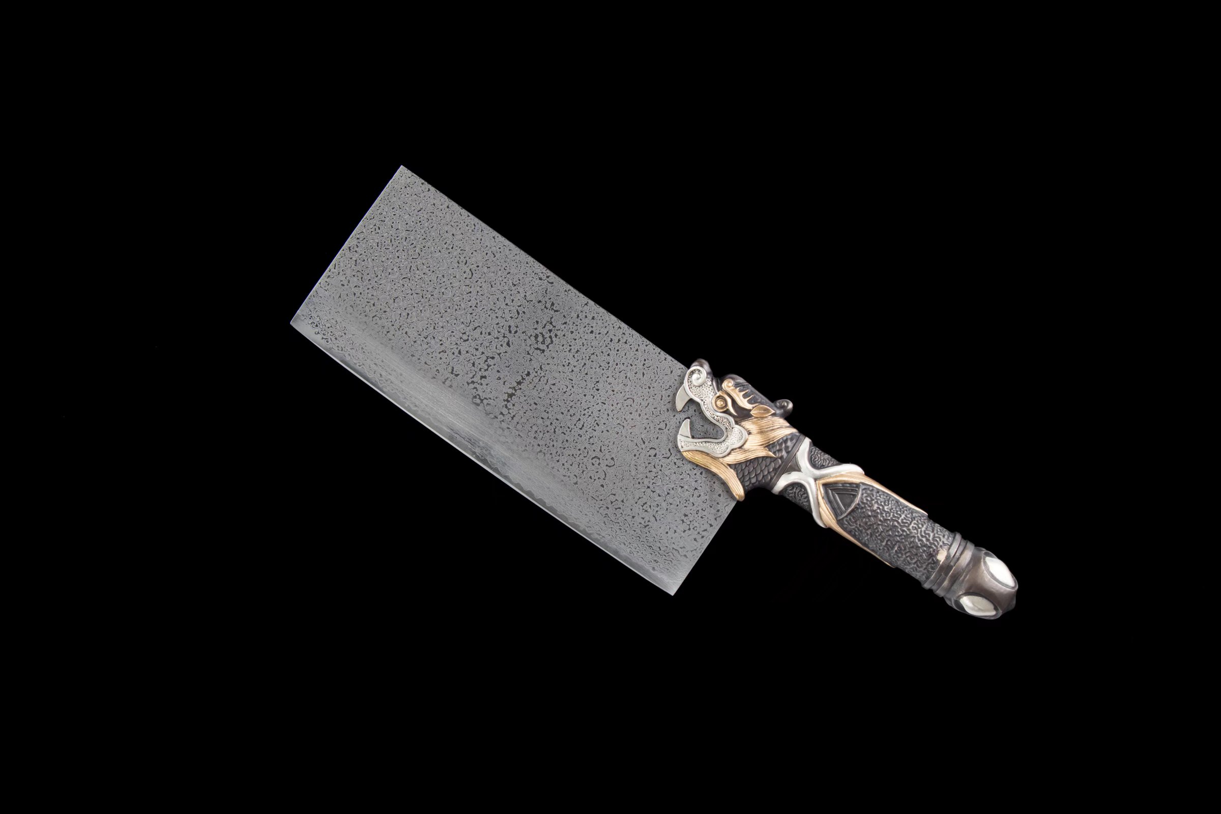 刀身手工锻造、不锈钢材料精细百炼、精细研磨、花纹清晰。纯铜刀柄、纯铜手工雕刀夹、古法鎏金银、