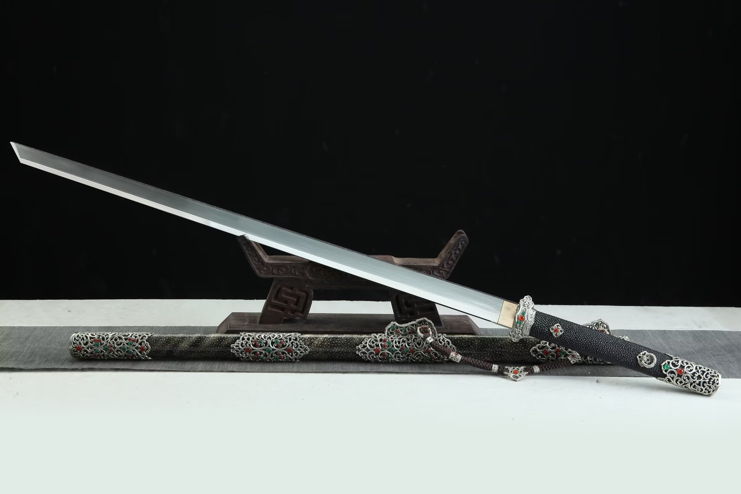 装貝:纯白铜镂空精雕、精细打磨、并镶嵌真玉石;(1)刀鞘:优质黑檀木;