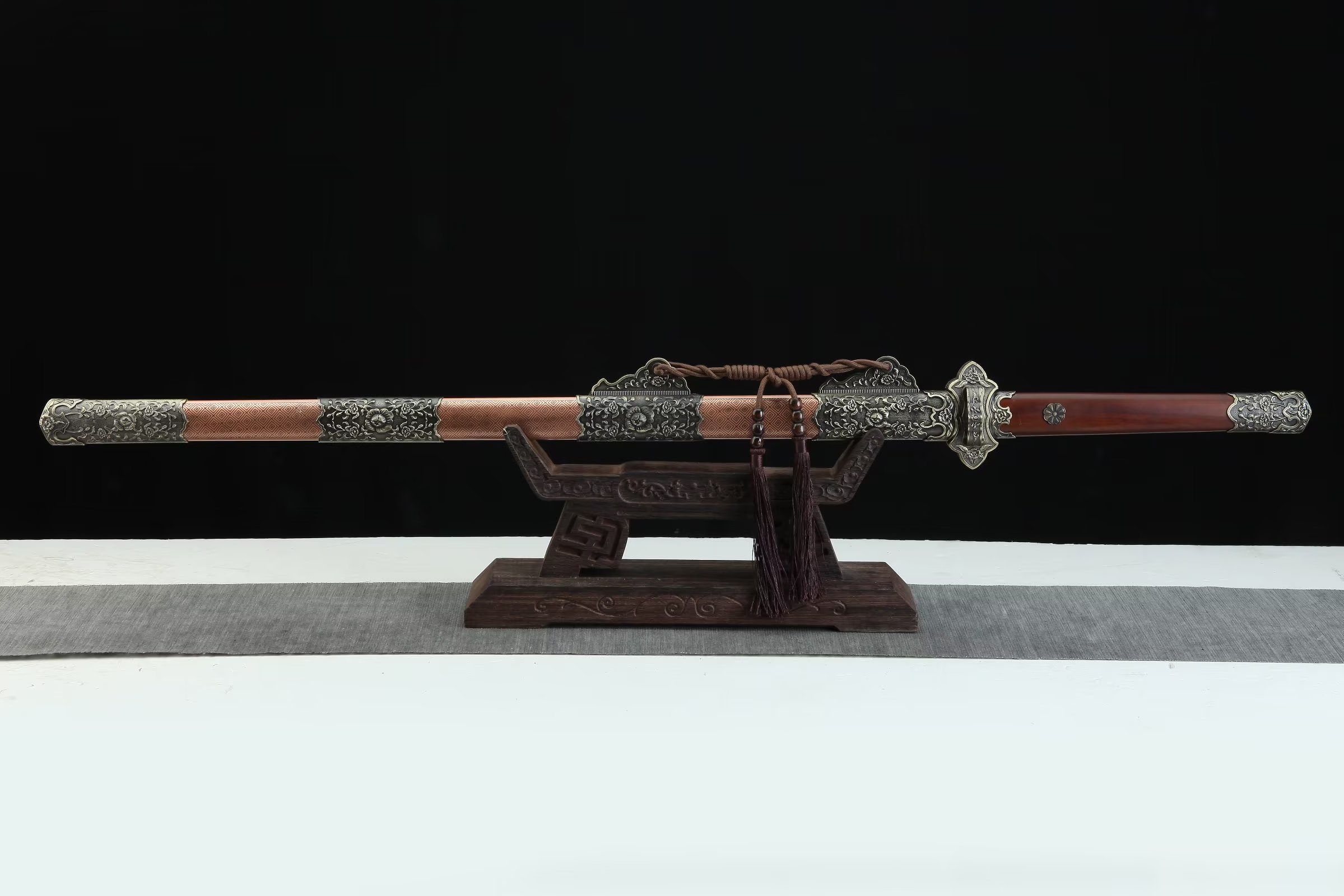 刀鞘采用纯铜手工包铜、刻花,将木梢用铜皮包上后起到防潮防湿、禁锢剑装作用、既美观又不会因天气、时间久远而收缩开裂;刀柄:优质酸枝木;刀身:百炼花纹钢、手工锻造、精细手磨960。花纹钢烧刃另加180。