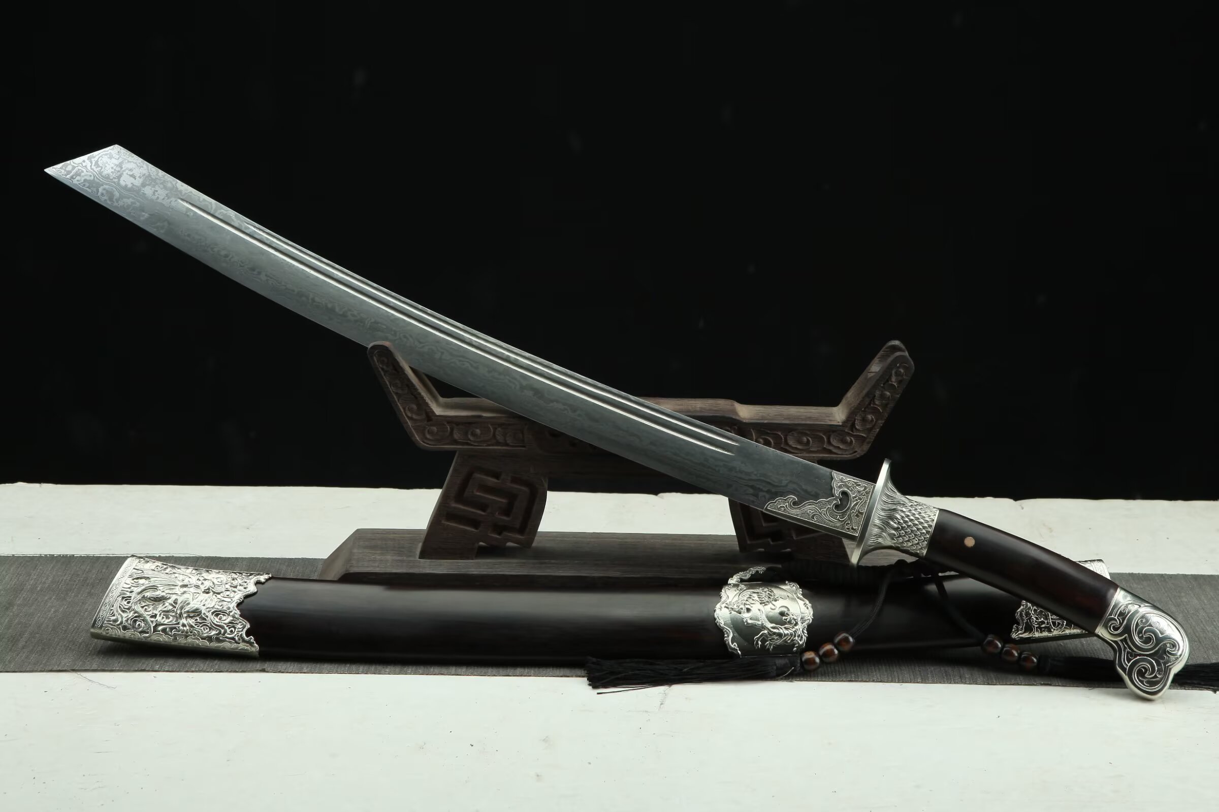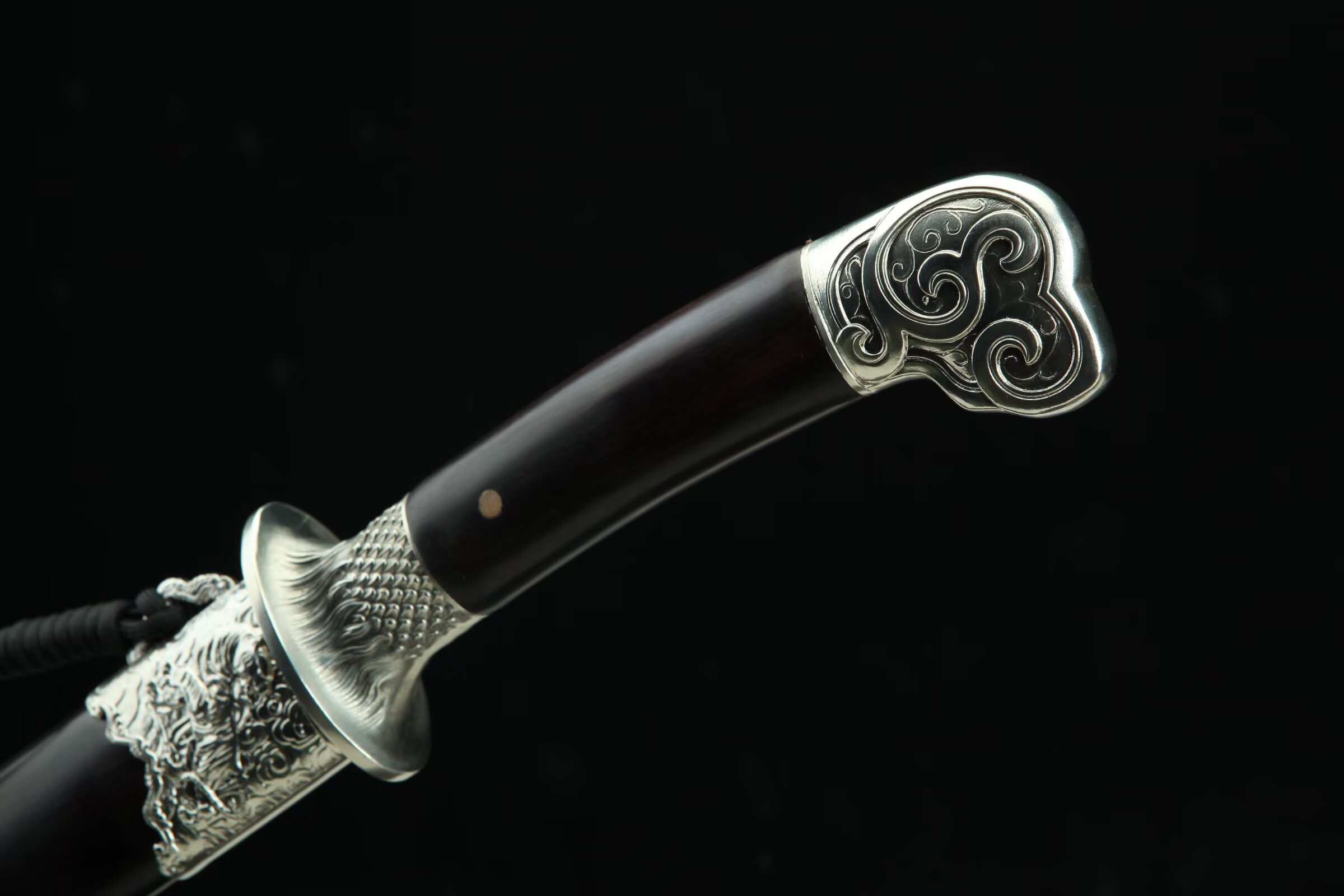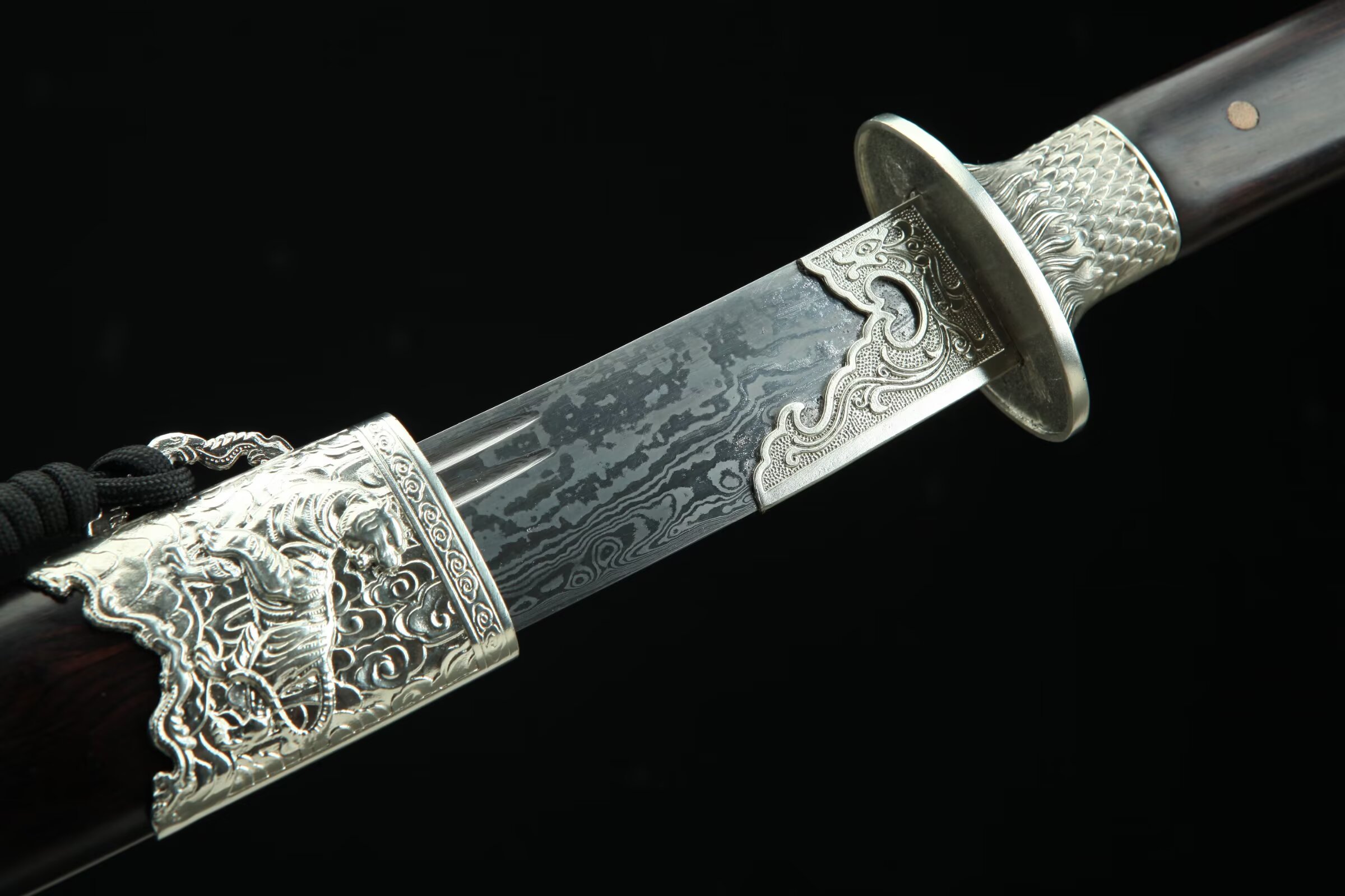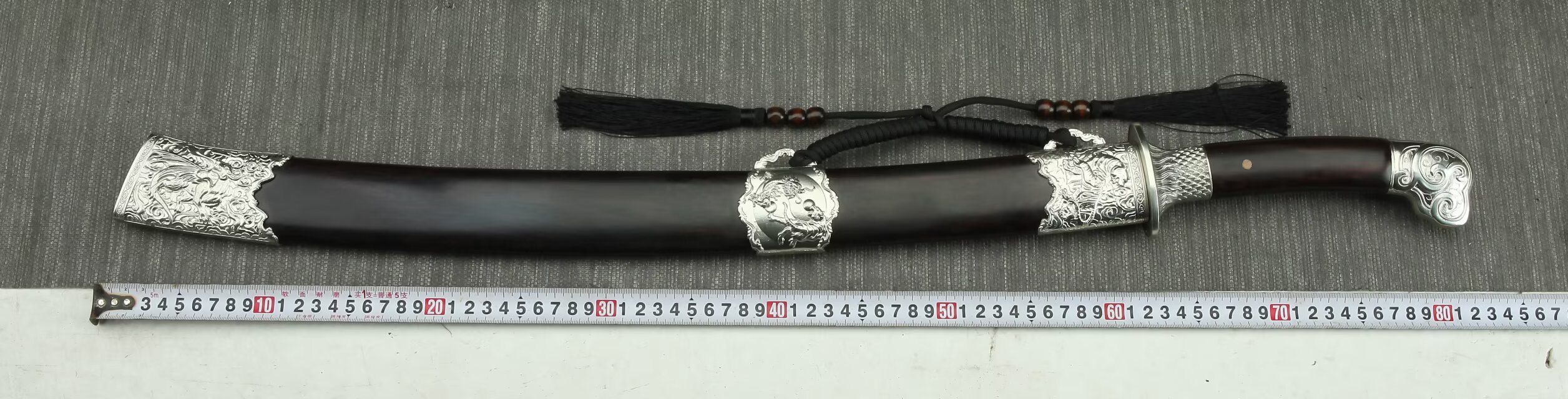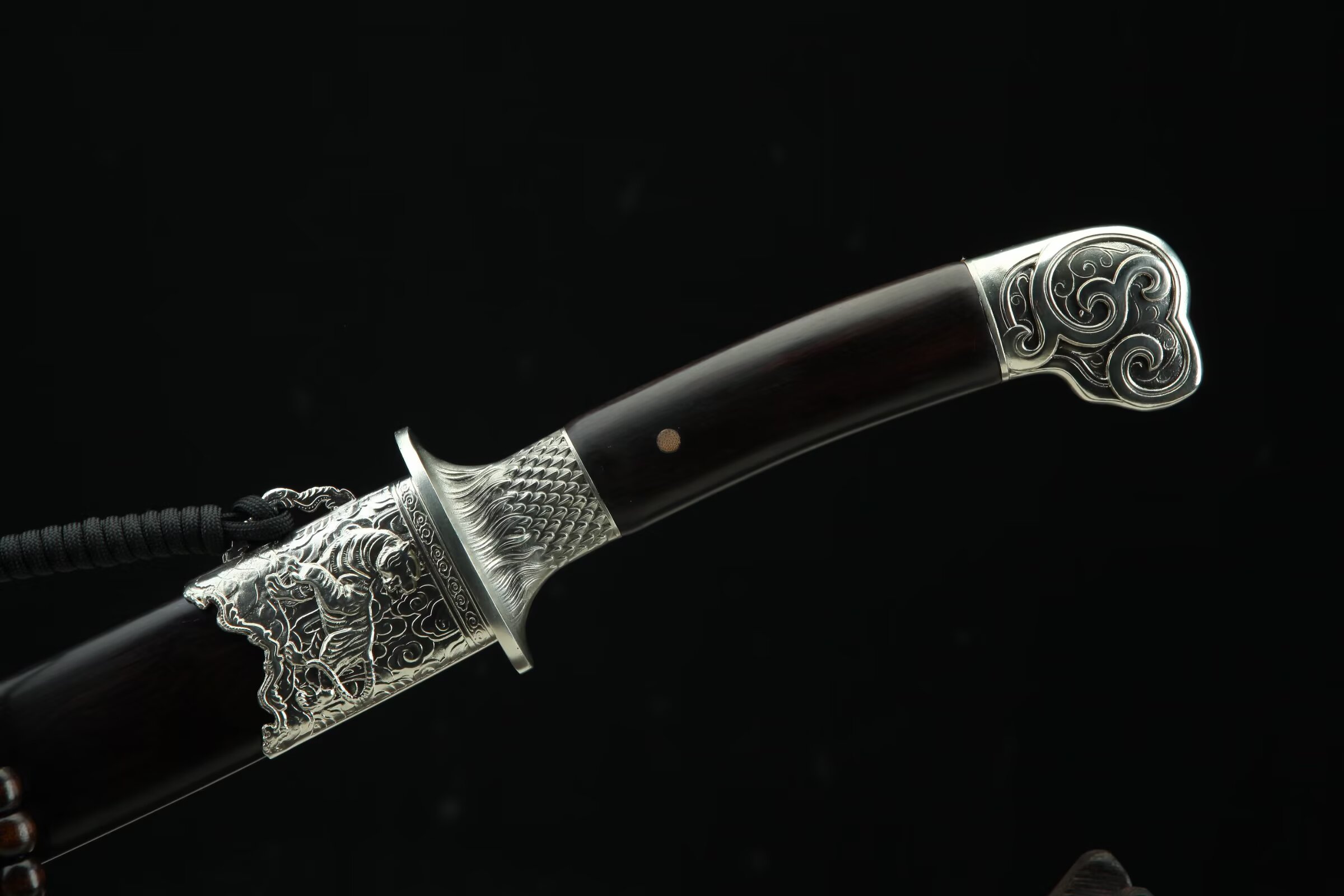 除鞘重:0.92kg装貝:白铜精雕、精细打磨、抛亮;刀鞘:优质黑檀木;刀身:百炼803低陨彩钢花纹钢、夹钢、手工锻造、精细研磨