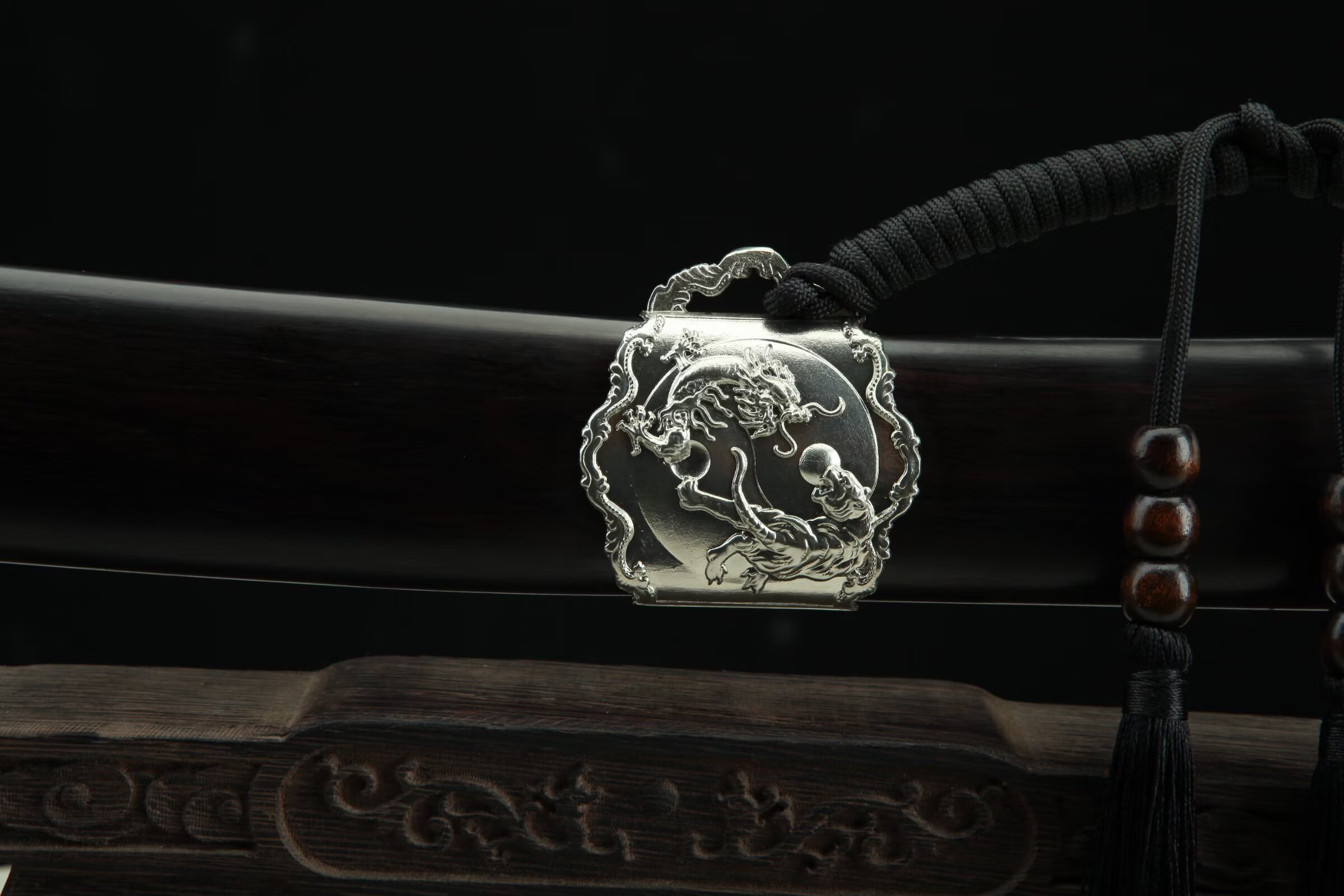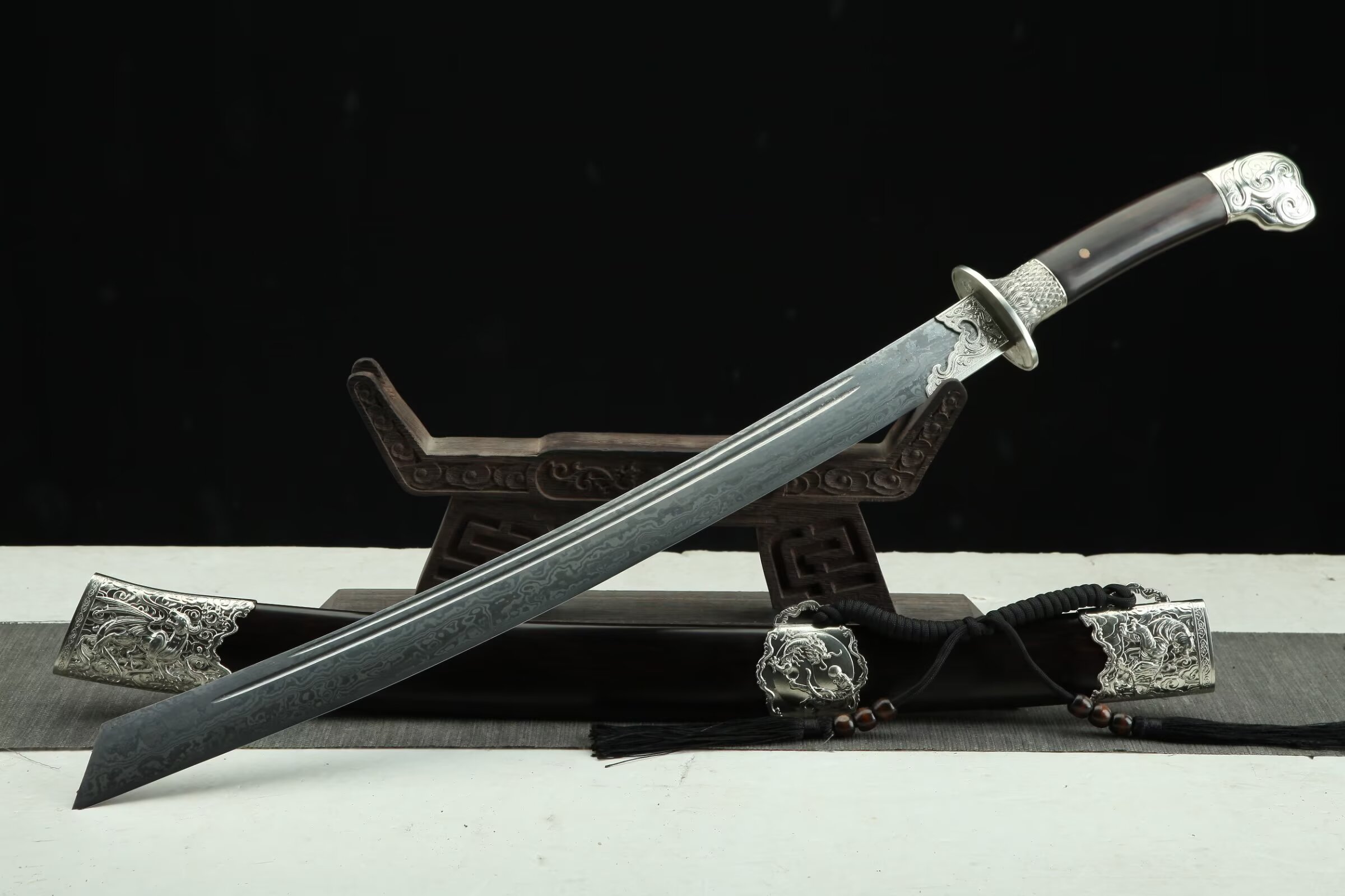 20寸白铜龙虎大刀(百炼803低陨彩钢花纹钢—黑檀木款)