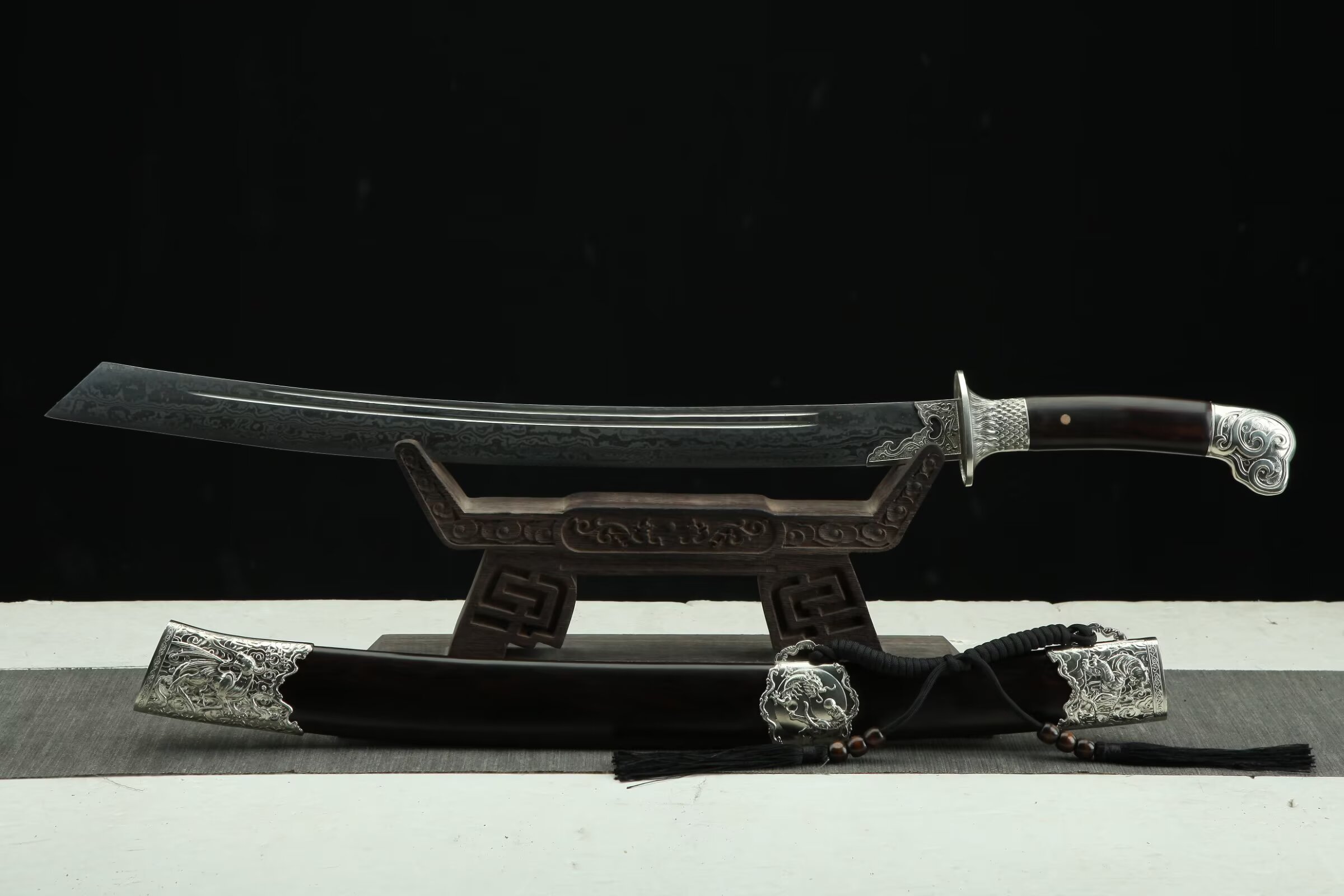 20寸白铜龙虎大刀(百炼803低陨彩钢花纹钢—黑檀木款)全长:80cm