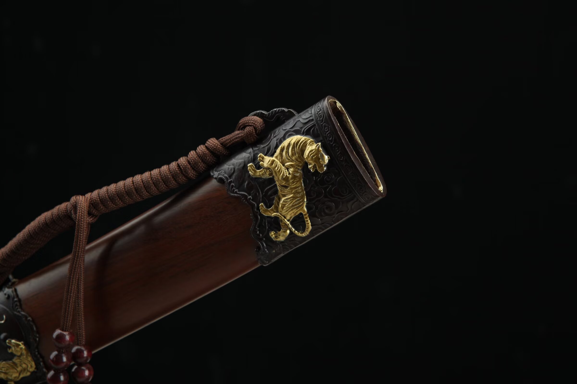 除鞘重:0.92kg装貝:黄铜精雕、精细打磨、古法鎏金、银、古铜三色;刀鞘:优质龙凤檀木;刀身:百炼803低陨彩钢花纹钢、夹钢、手工锻造、精细研磨