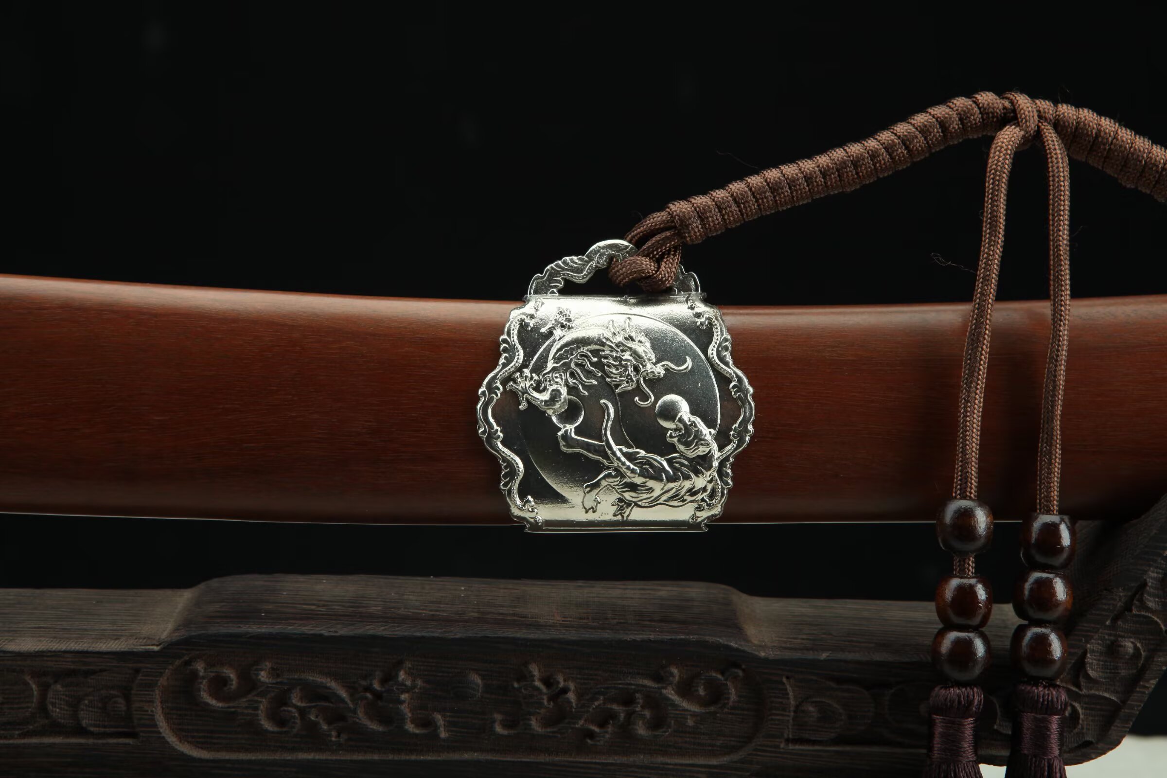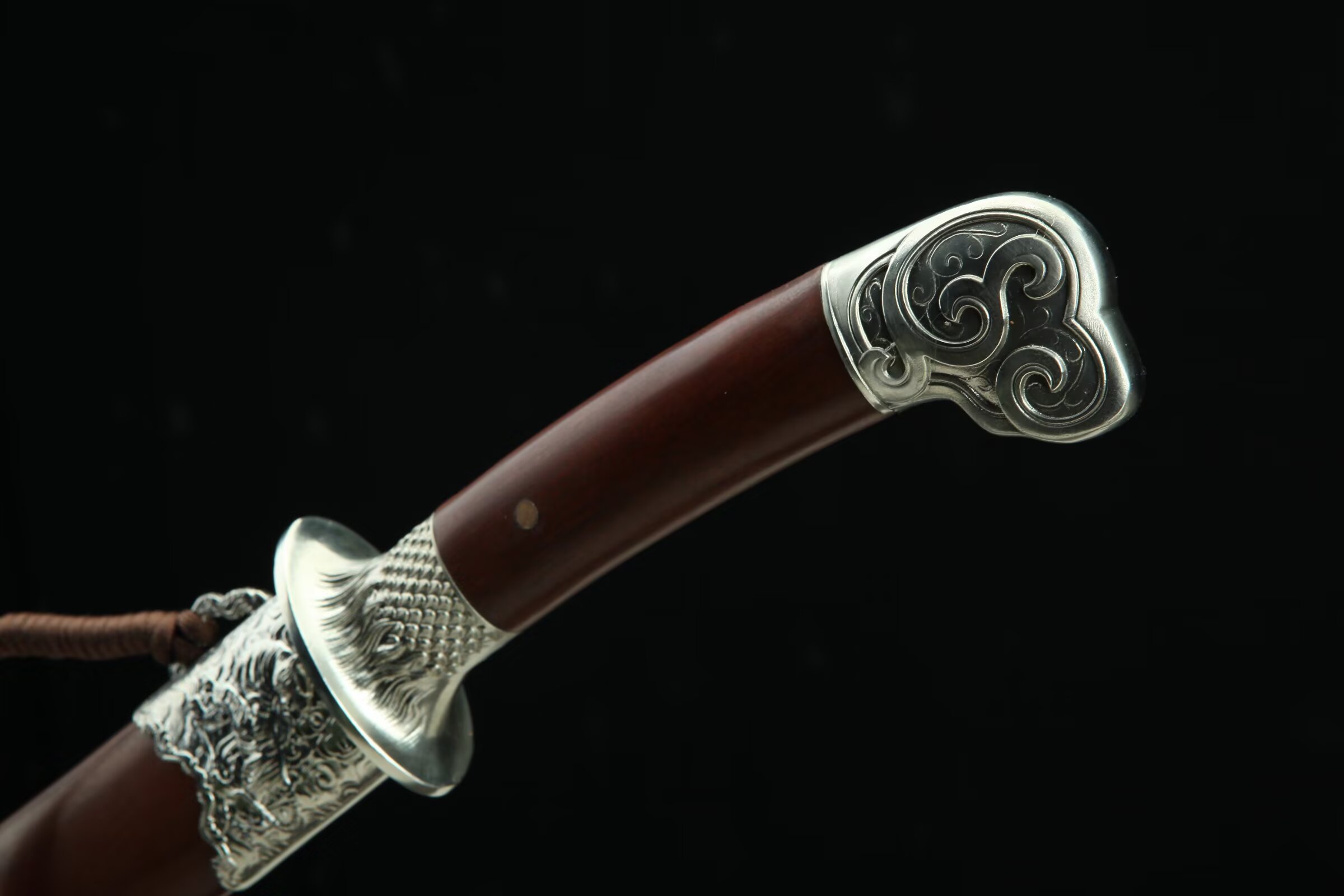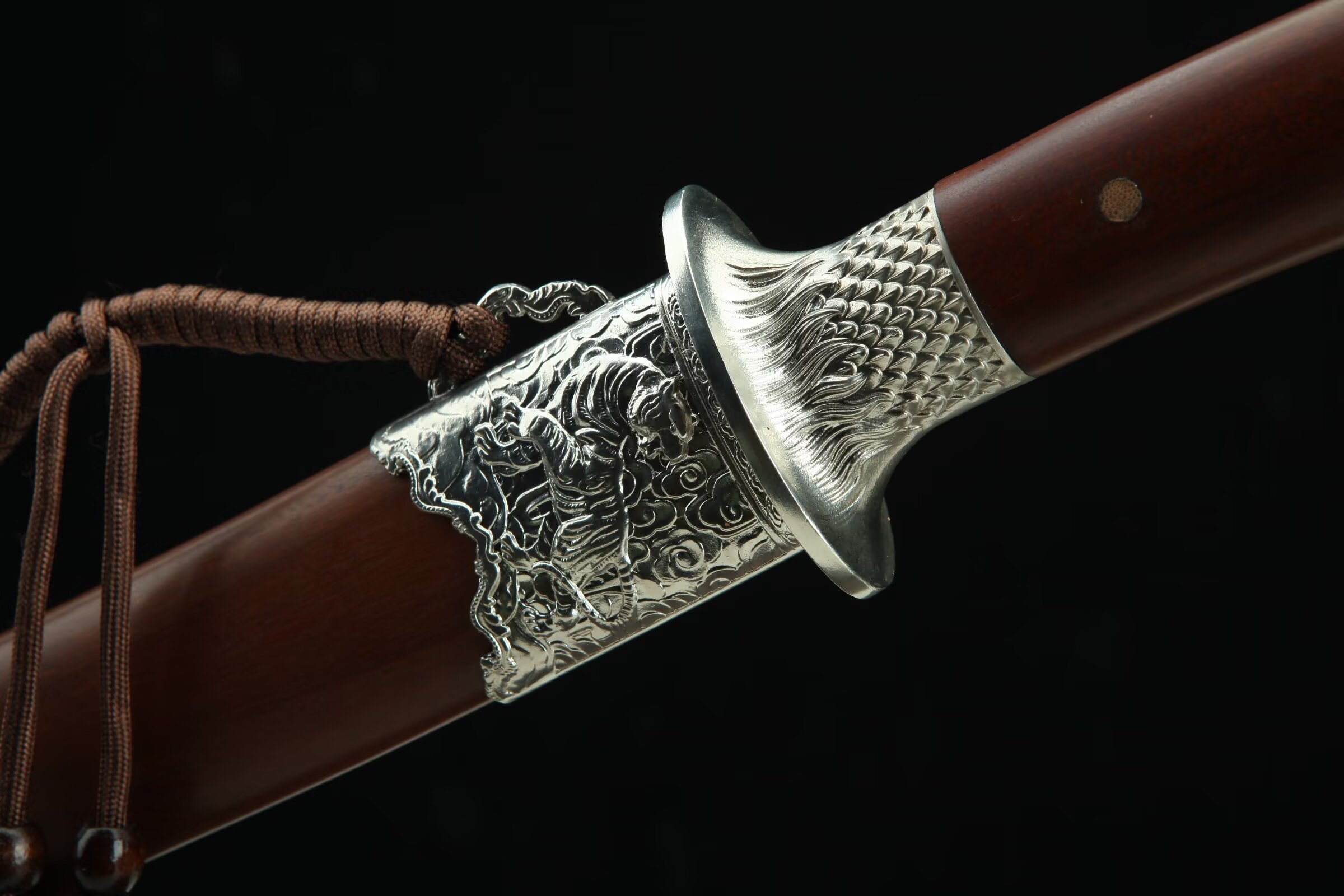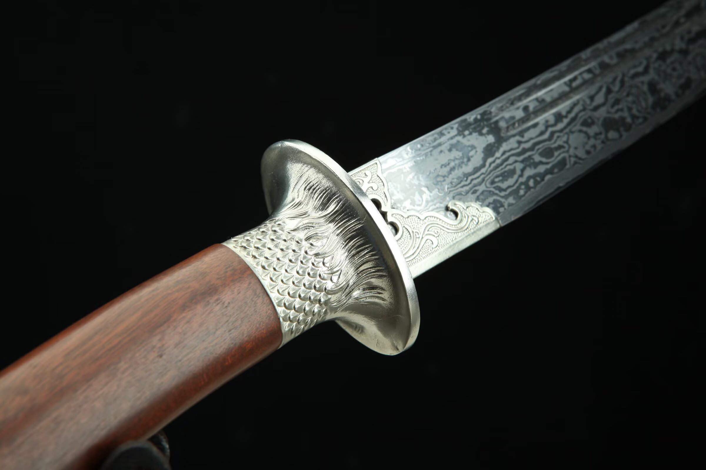 除鞘重:0.92kg装貝:白铜精雕、精细打磨、抛亮;刀鞘:优质龙凤檀木;刀身:百炼803低陨彩钢花纹钢、夹钢、手工锻造、精细研磨