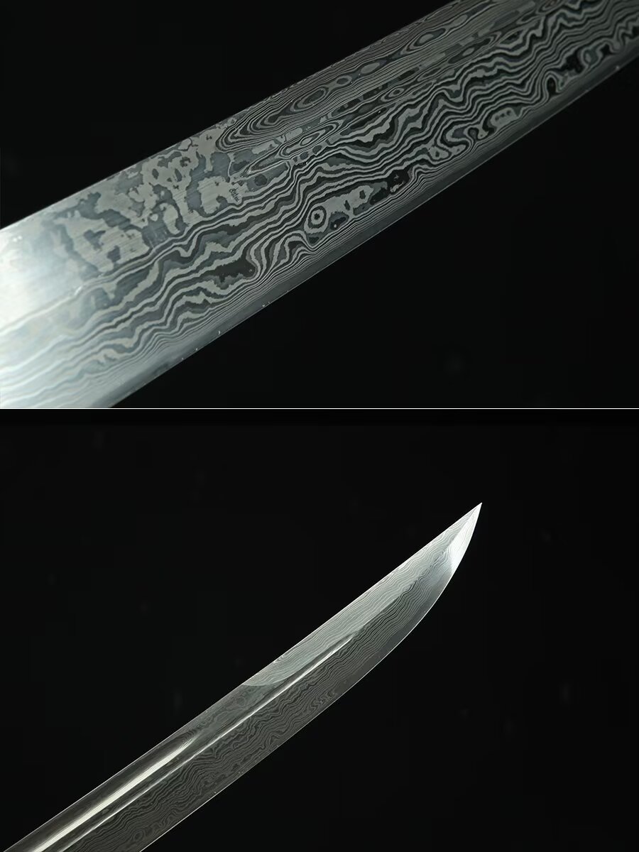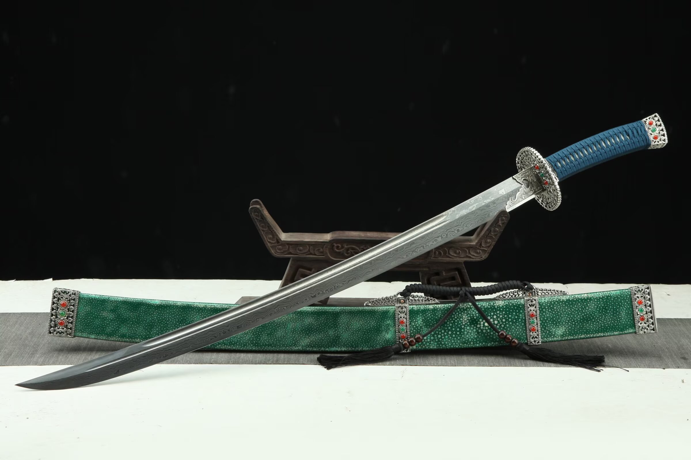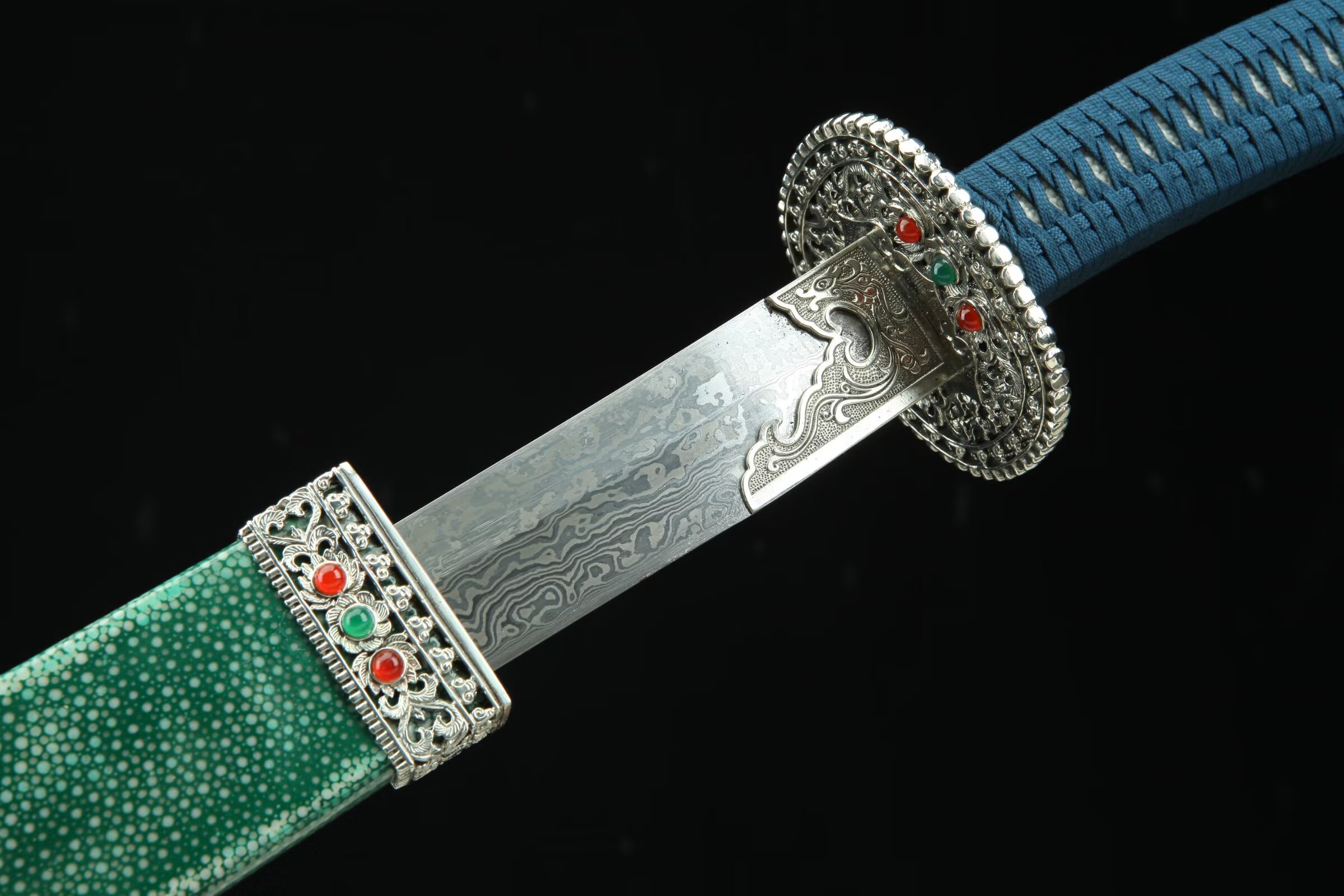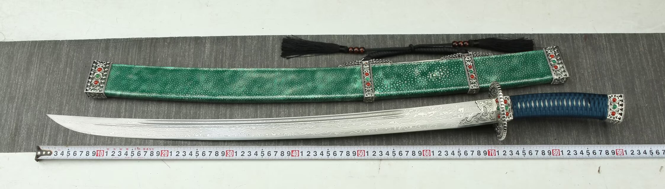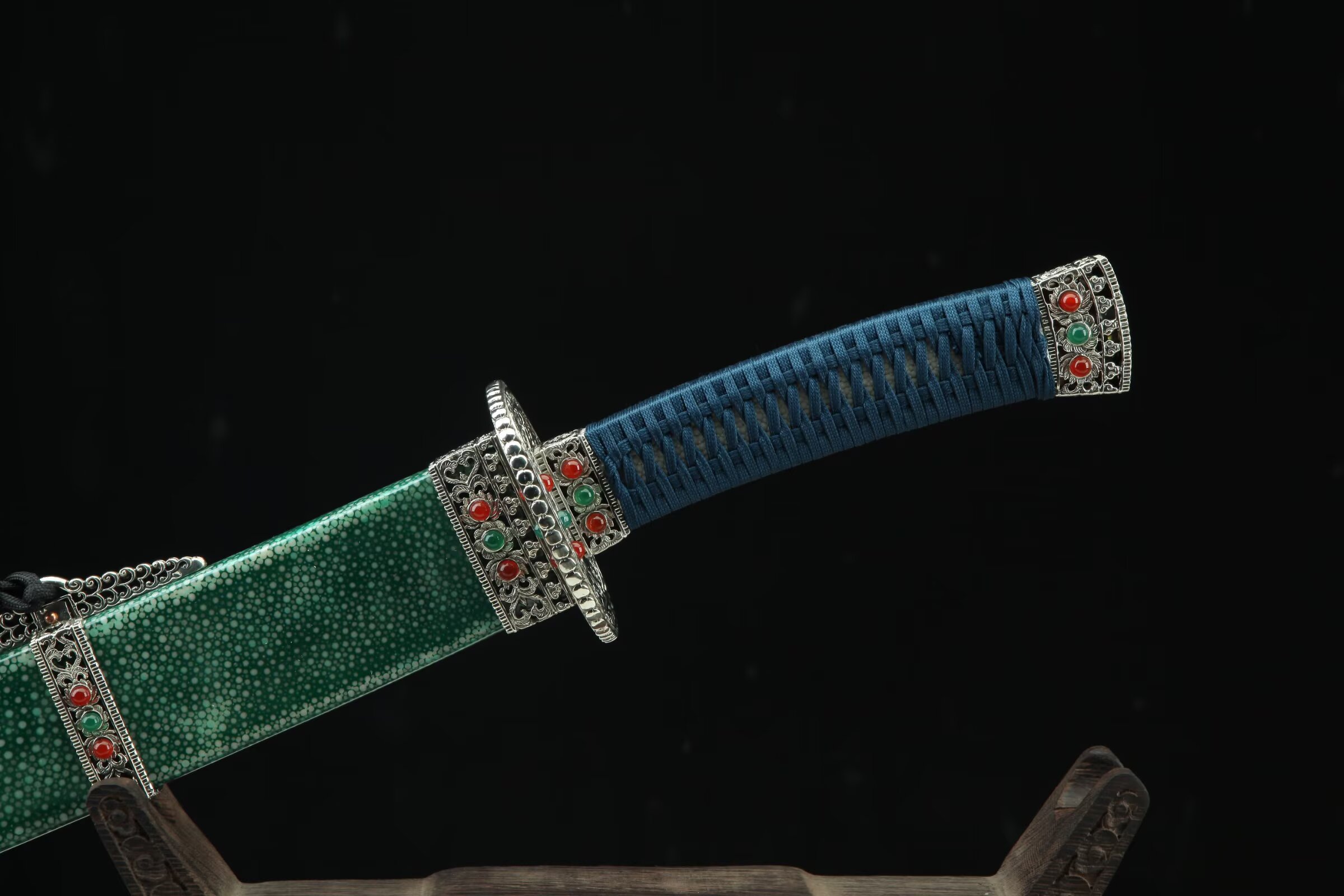 装貝:白铜镂空精雕、精细打磨、镶嵌红绿玉宝石;刀鞘:龙泉木包鱼皮;刀身:百炼低陨彩钢三枚夹钢花纹钢、夹钢、精细研磨