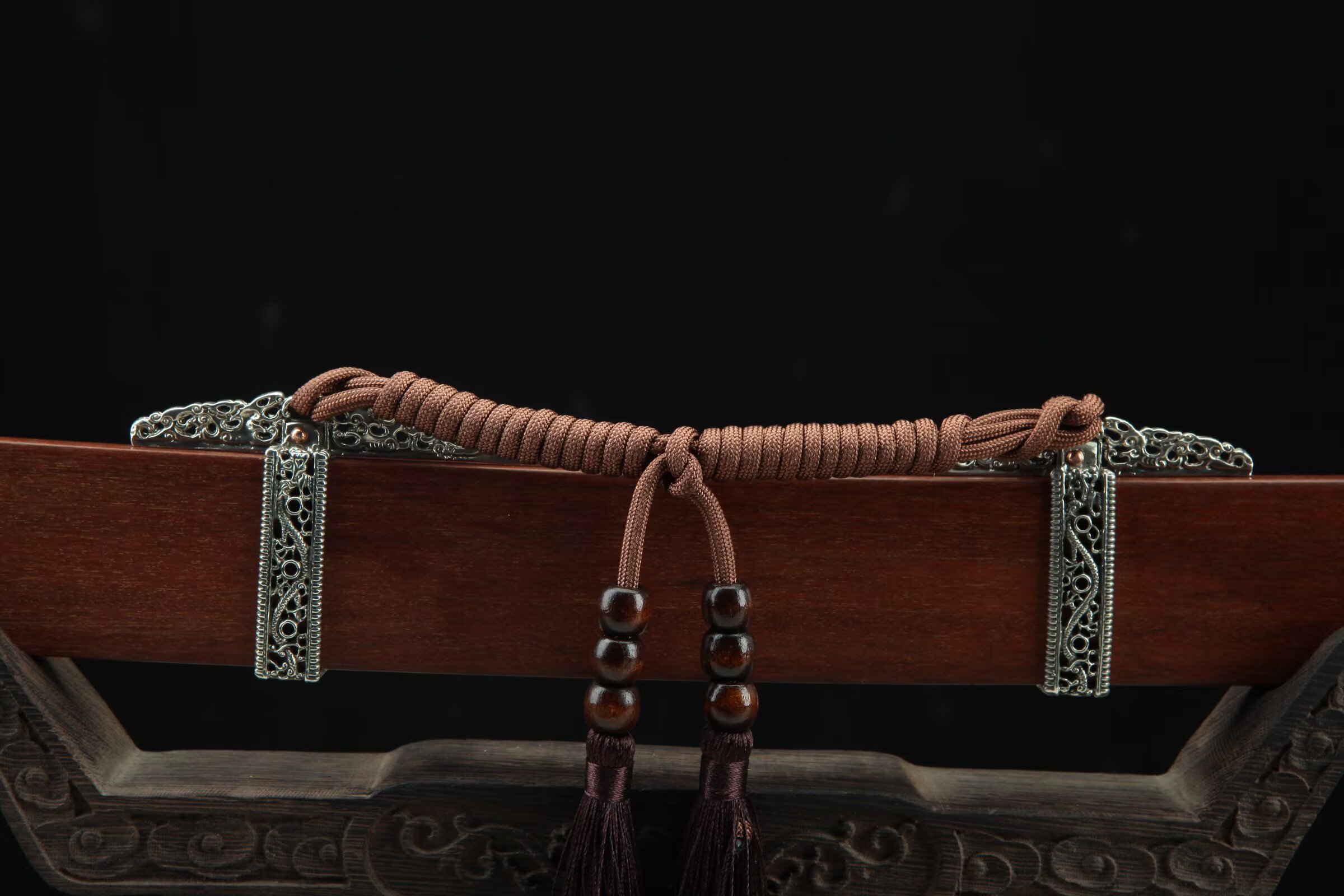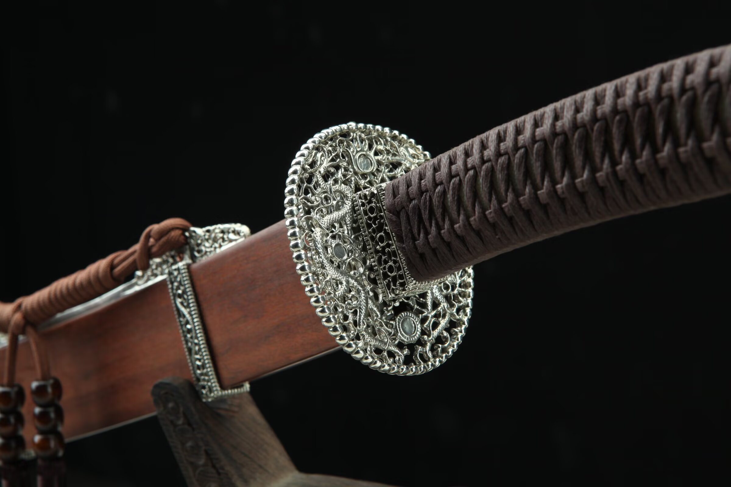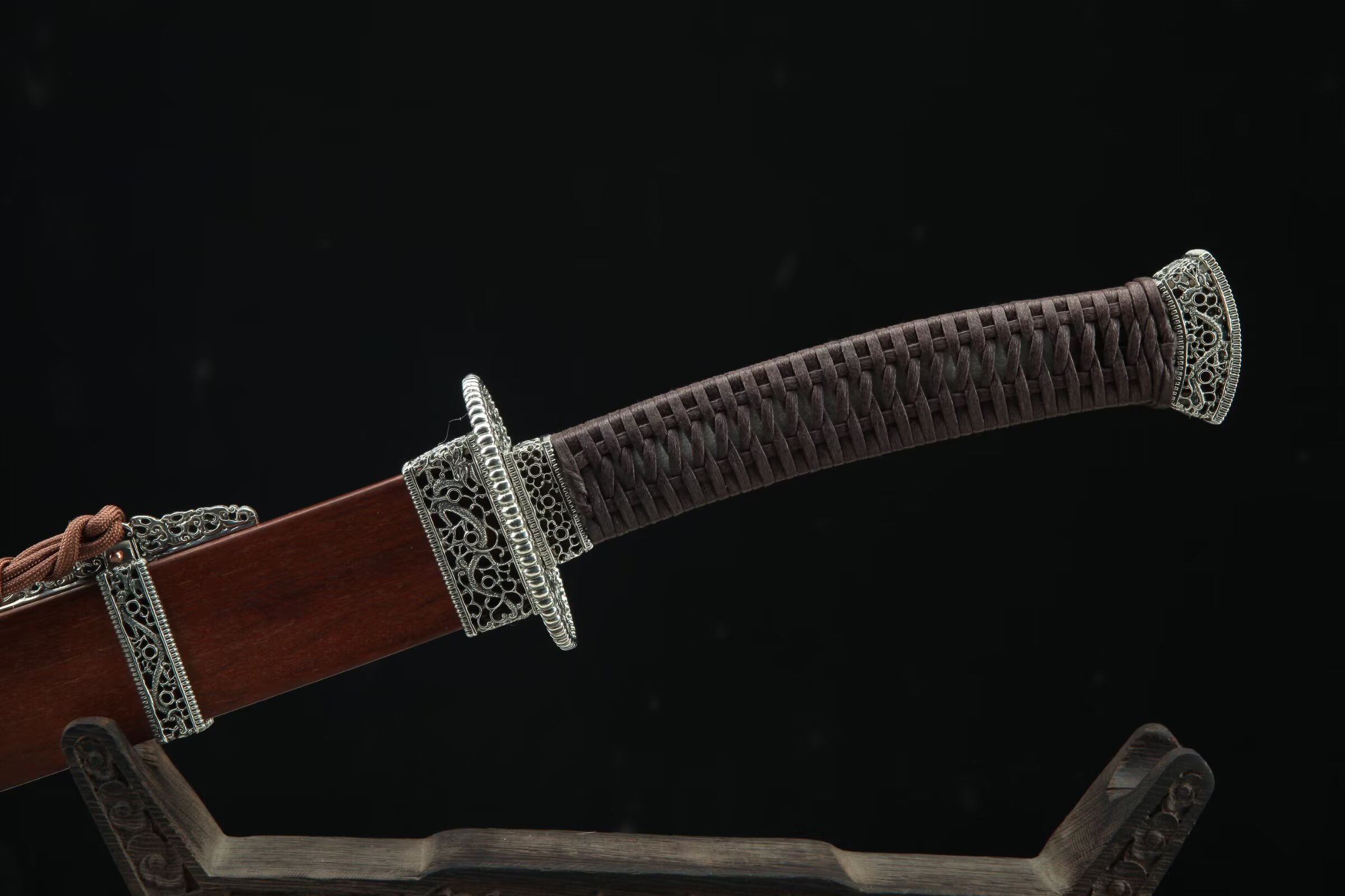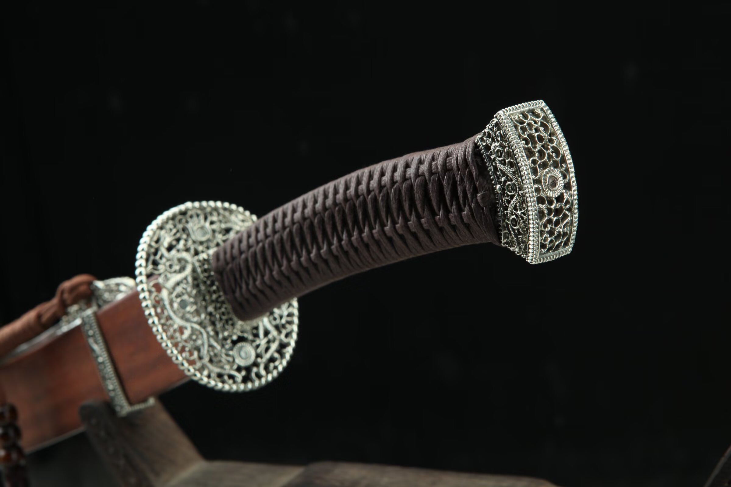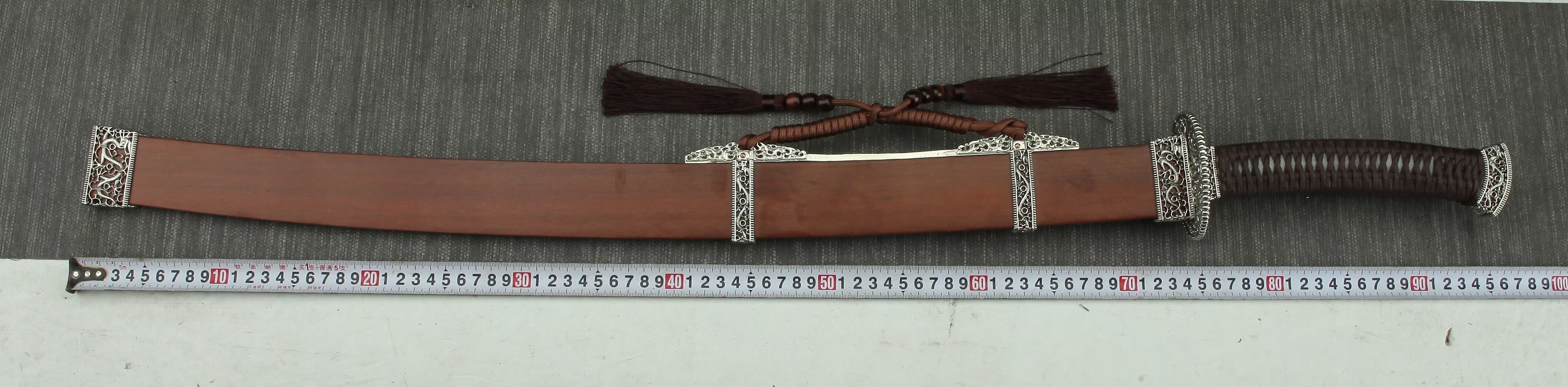 除鞘重:0.98kg装貝:白铜镂空精雕、精细打磨抛亮。刀鞘:优质龙凤檀木;刀身:百炼花纹钢、手工锻造、精细研磨百炼花纹钢烧刃另加180
