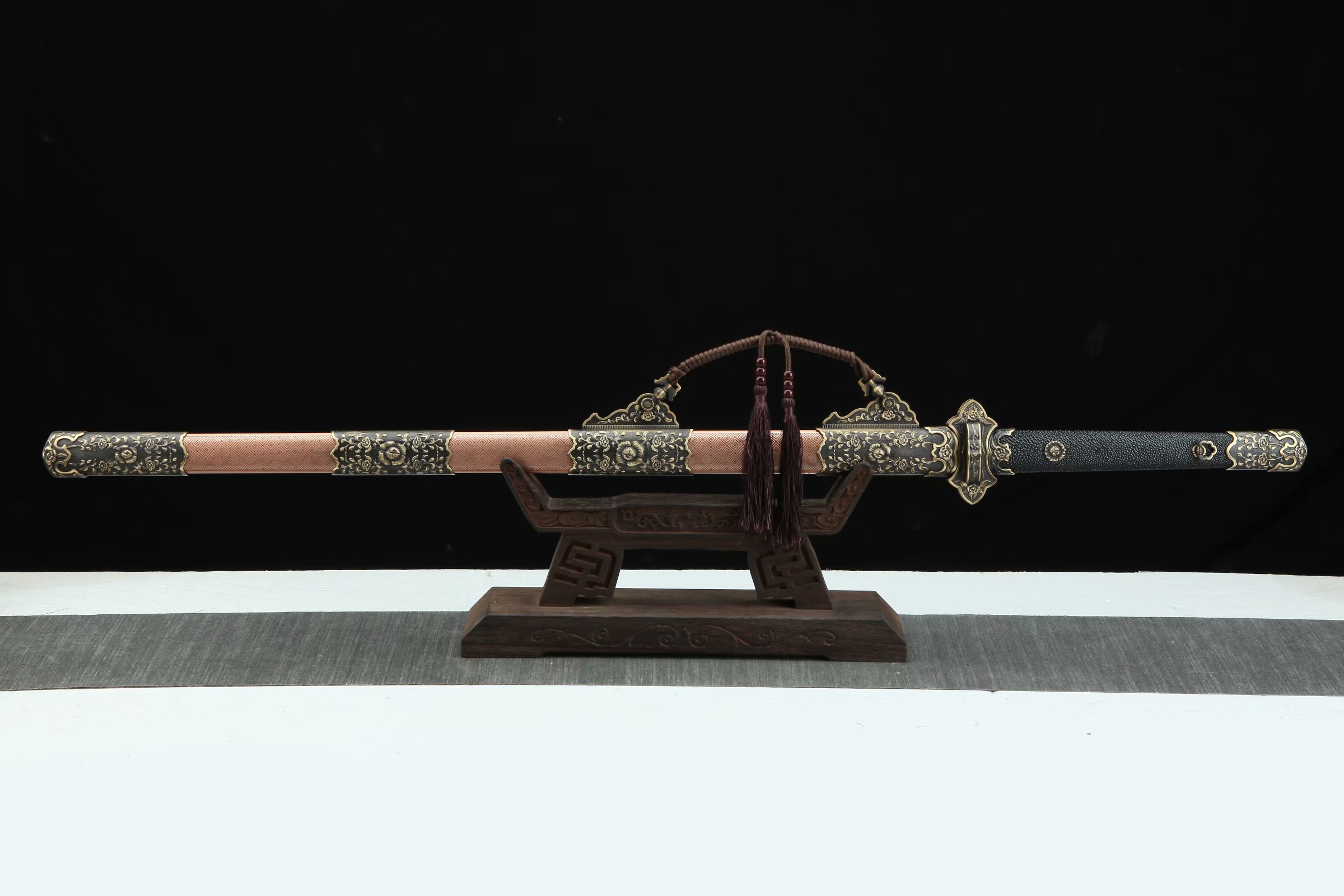 装具:纯铜精雕、精细打磨做旧;剑鞘:用纯紫铜手工包铜、刻花,将木梢用紫铜板包上后起到防潮防湿、