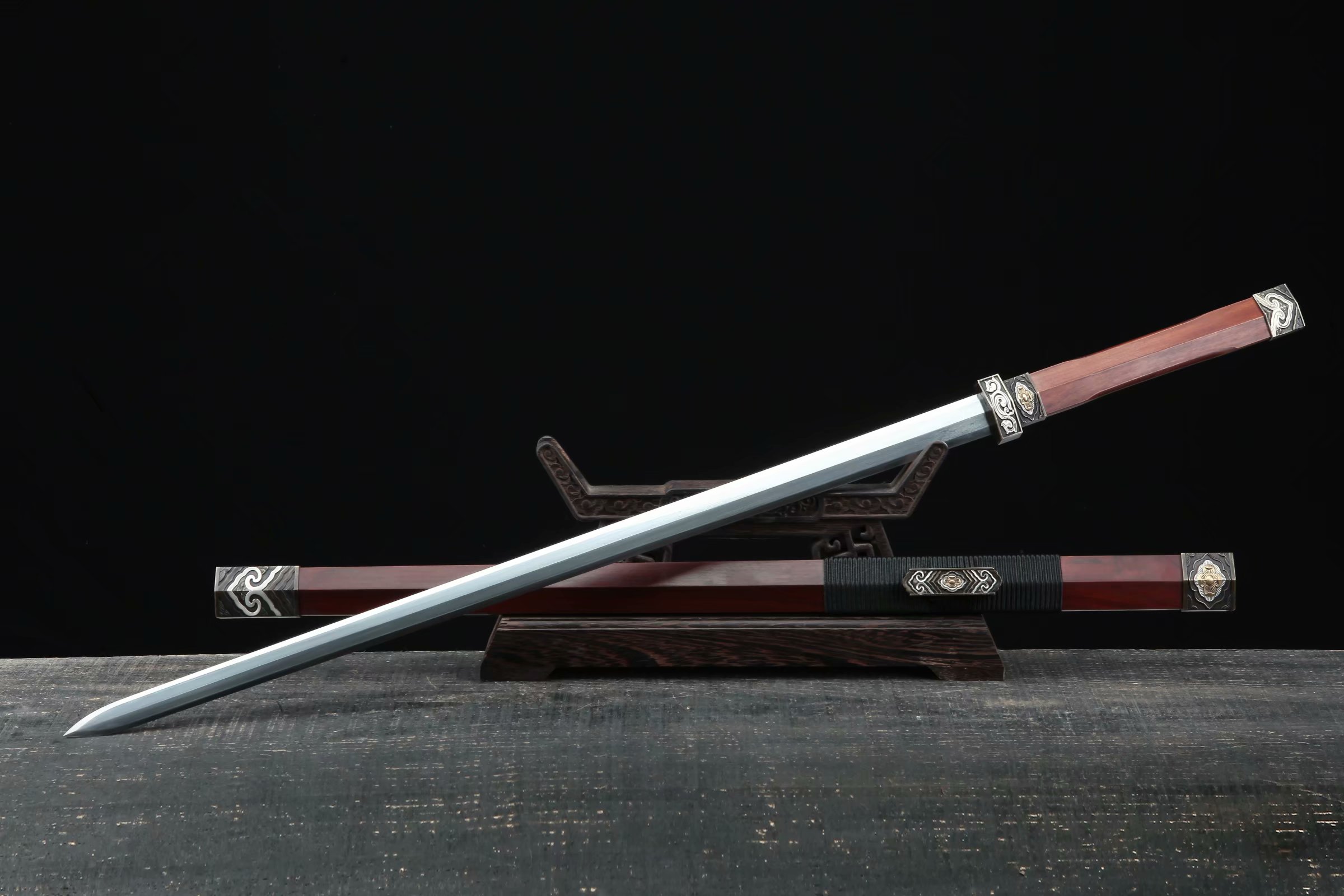 剑鞘:优质酸枝木;剑身:百炼花纹钢、手工锻造、精细研磨885。 花纹钢烧刃另加180。