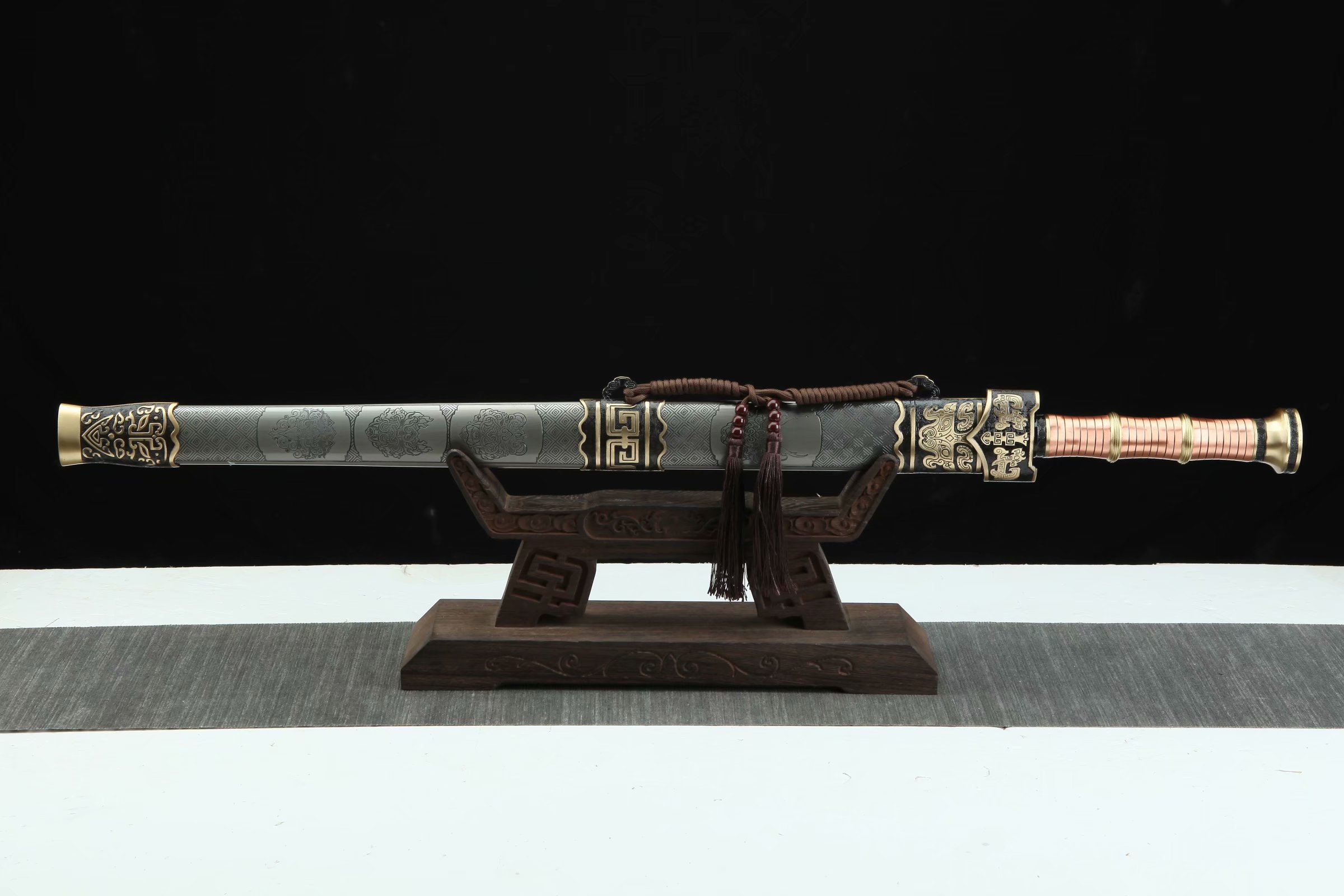 剑鞘:用金属材料手工制作、仿古银设计、刻花、将木梢包上金属鞘后起到防潮防湿、禁锢剑装作用、既美观又不会因天气、时间久远而收缩开裂;