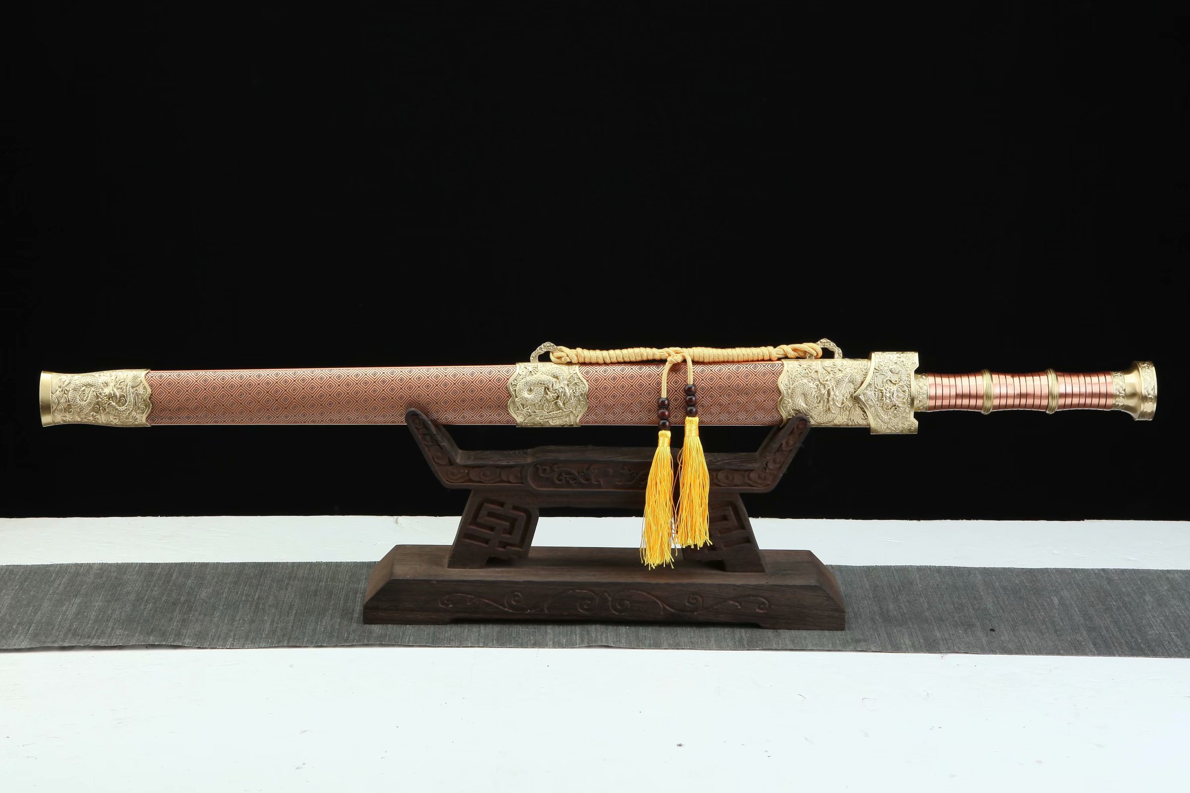 装具:纯铜精雕、精细打磨、抛亮铜;剑鞘采用纯铜手工包铜、刻花,将木梢用铜皮包上后起到防潮防湿、