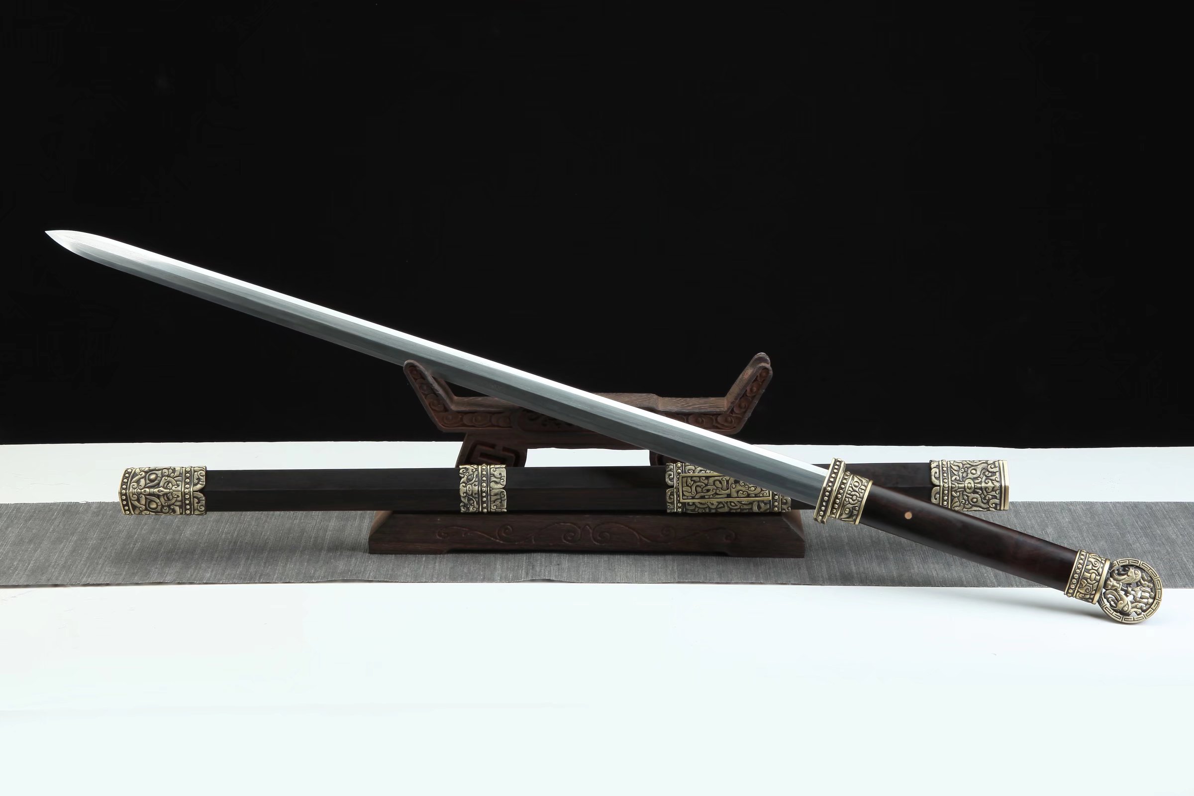 装具:纯铜精雕、纹理细腻、精细打磨做旧;剑鞘:优质黑檀木;