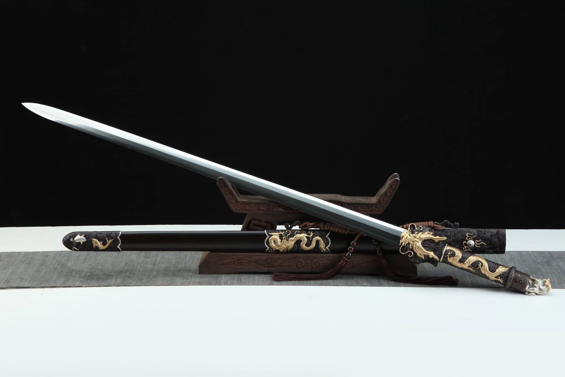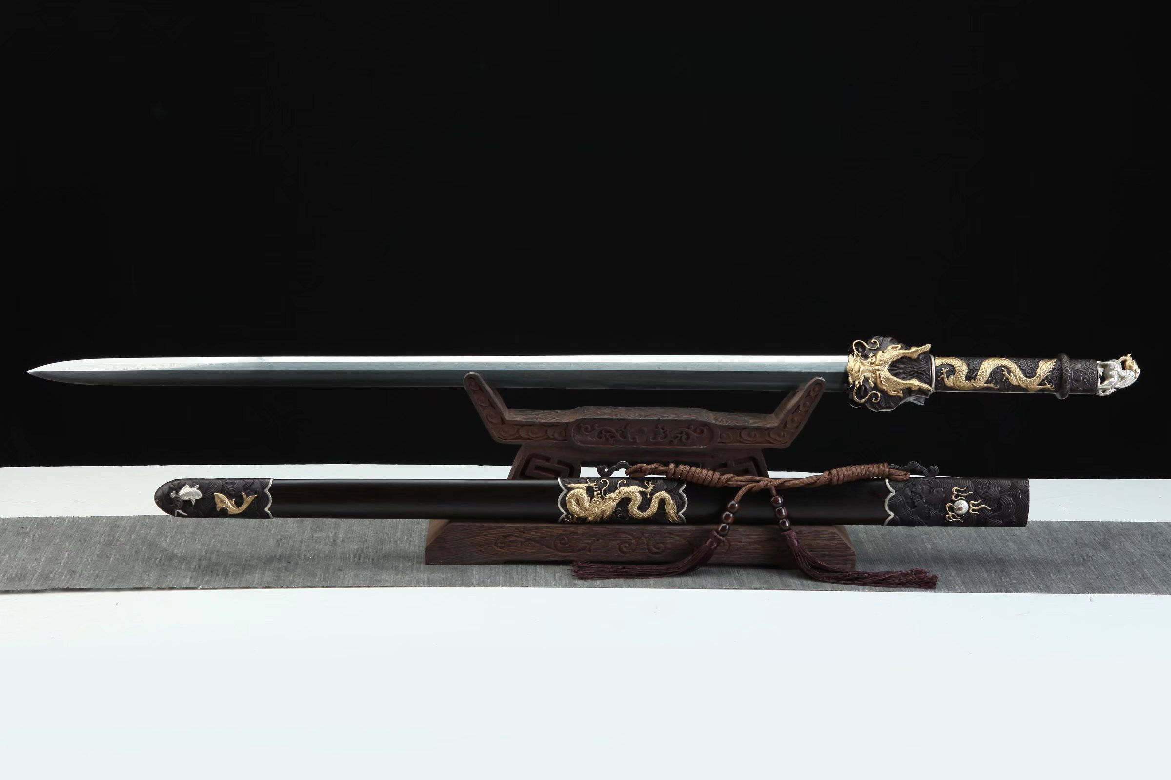 三色铜龙王剑。装具:纯铜精雕、精细打磨、古法鎏金、银、铜三色;剑鞘:优质黑檀木;